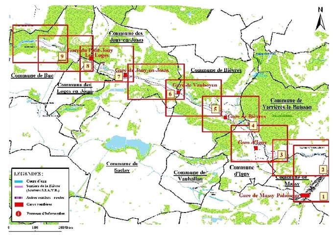 En partant de l’amont vers l’aval, six gares permettent d’accéder aux sentiers piétons du S.I.A.V.B. : les gares, du Petit Jouy les Loges, de Jouy-en-Josas, de Vauboyen, de Bièvres, d’Igny, et de Massy-Palaiseau.